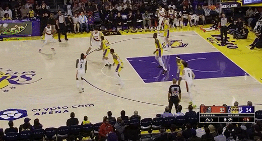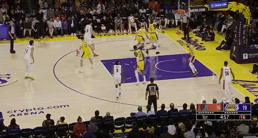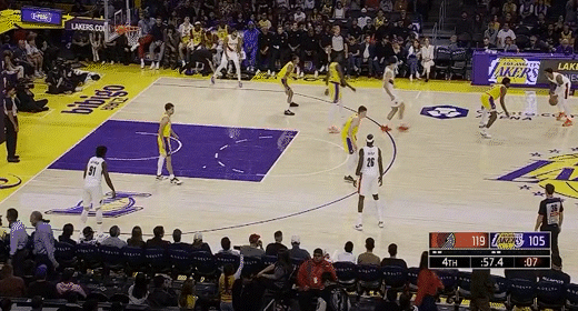 第三节湖人里夫斯拿下9分,开拓者朱-霍勒迪拿下7分,第三节结束湖人77-89落后开拓者